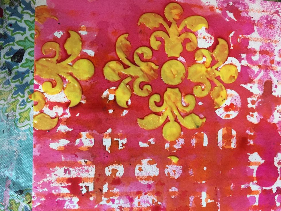 With a palette knife using Art Anthology's Rosette stencil and Art Anthology's Velvet in Lemon Tart add to the page.