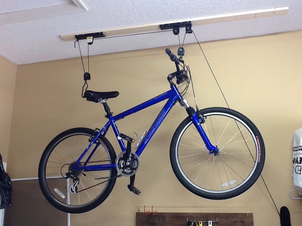 Bicycle hoisted and excess pulley rope attached to wall holder. Yea!!! Done!!!!