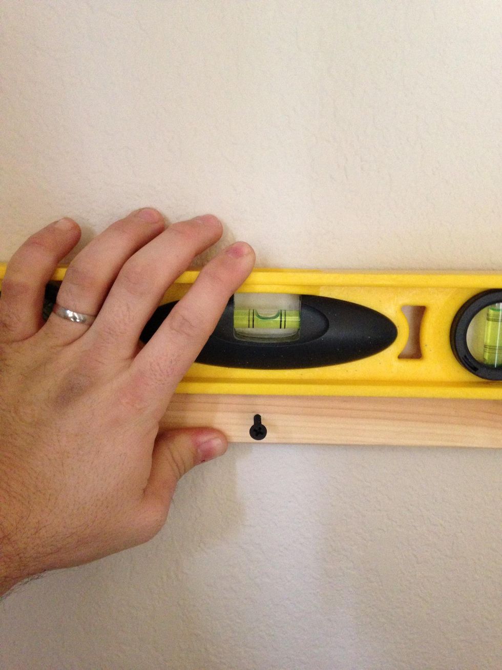 Place each wood strip below the line you drew previously, making sure it is level, and then screw it in.