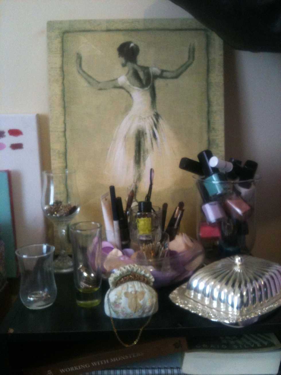 This is a glass bowl with a wine glass in the middle and shot glasses around it , in each I have bobby pins , makeup brushes ect