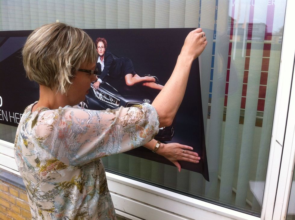 Hold folien ud fra vinduet og forsigtig trykkes/skrabes Folien ind på vinduet fra midten og ud til venstre side.