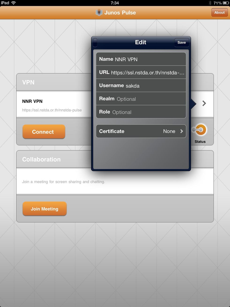 Download app "Junos Pluse" in appstoreOpen app and configurationUrl : https://ssl.nstda.or.th/nnstda-pulse User : Pass : Click connect and see top status show vpn. See it ready for use Open safari and fill url to https://x.nstda.or.th