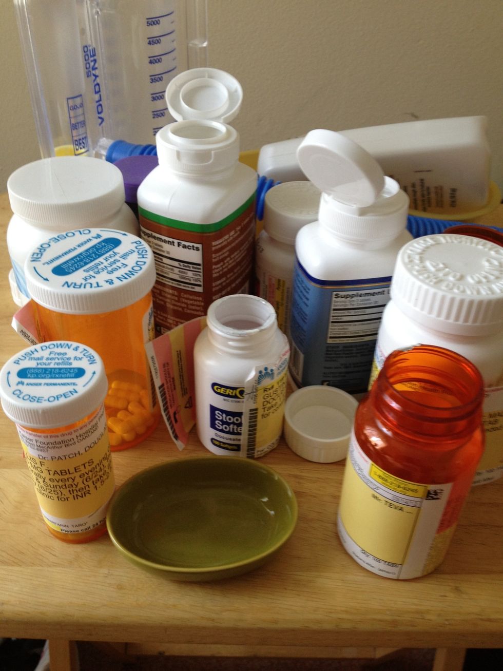 When I came home from the hospital a couple weeks ago, our friend Clarke set up this system to keep track of all the pills I had to take take.