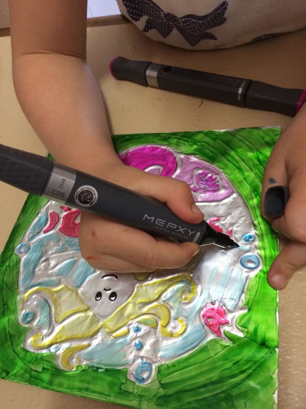 Then using Mepxy Markers colour in leaving the raised glue foil without colour.