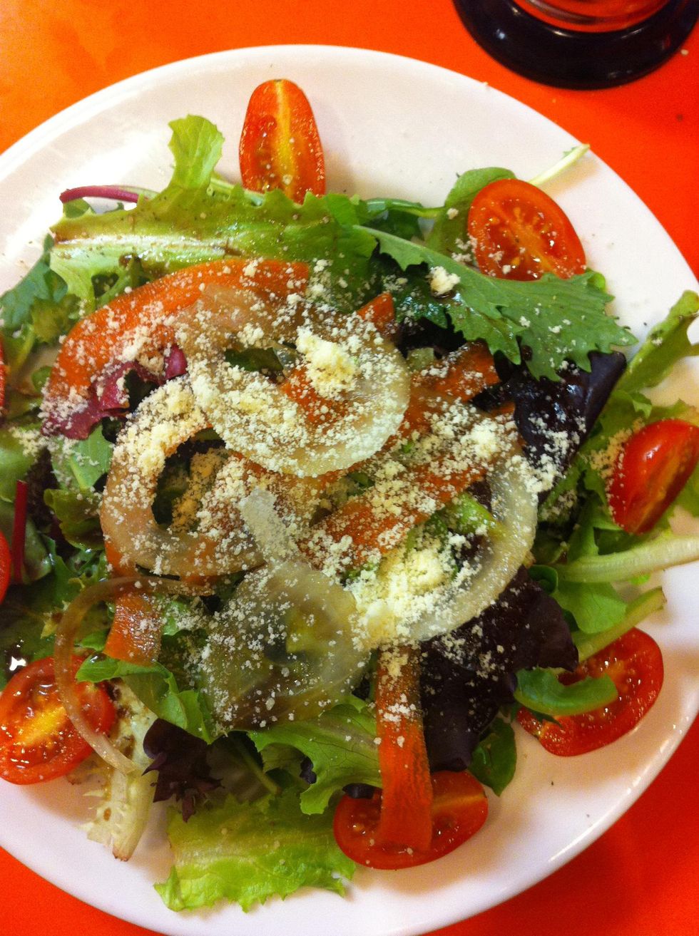 1.0bnch Spring Mix4.0 Grape or Cherry Tomatoes (halved)1.0 Carrot Strips (blanched)1.0 Sliced Onions (blanched)1.0 Balsamic-Soy Dressing1.0 Parmesan Cheese1.0 Salt & Pepper to taste