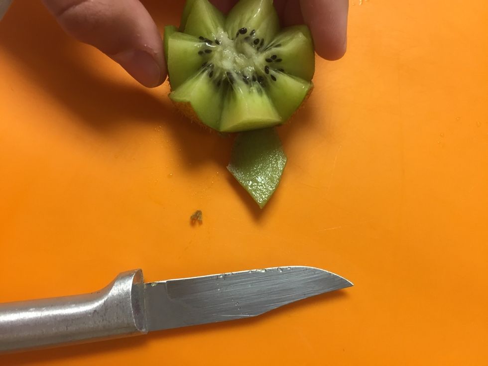 Make diagonal cuts in the center of the kiwi, making triangles.