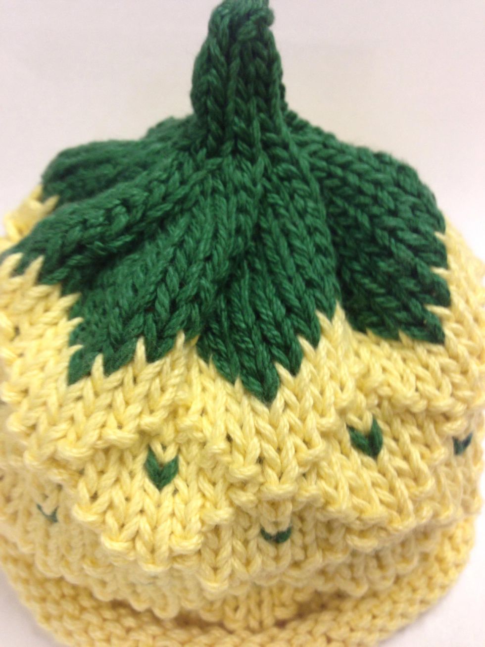 This pattern can be modified to make strawberries (use red yarn instead of yellow; no pearling), boysenberries (with purple yarn and bobbles every 8th stitch).