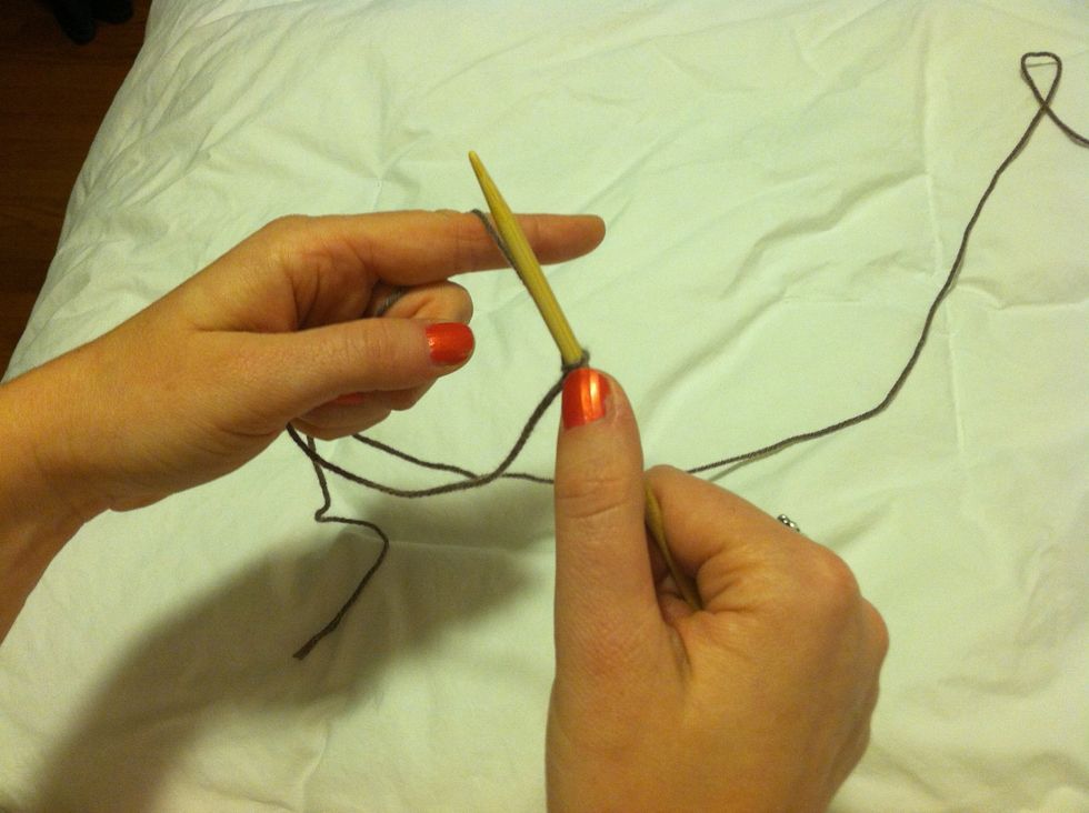 Hold the ends together with the pinky of your left hands so thet the yarn is tight over you thumb and pointer finger. Pull the string above toward the needle point to form a V.