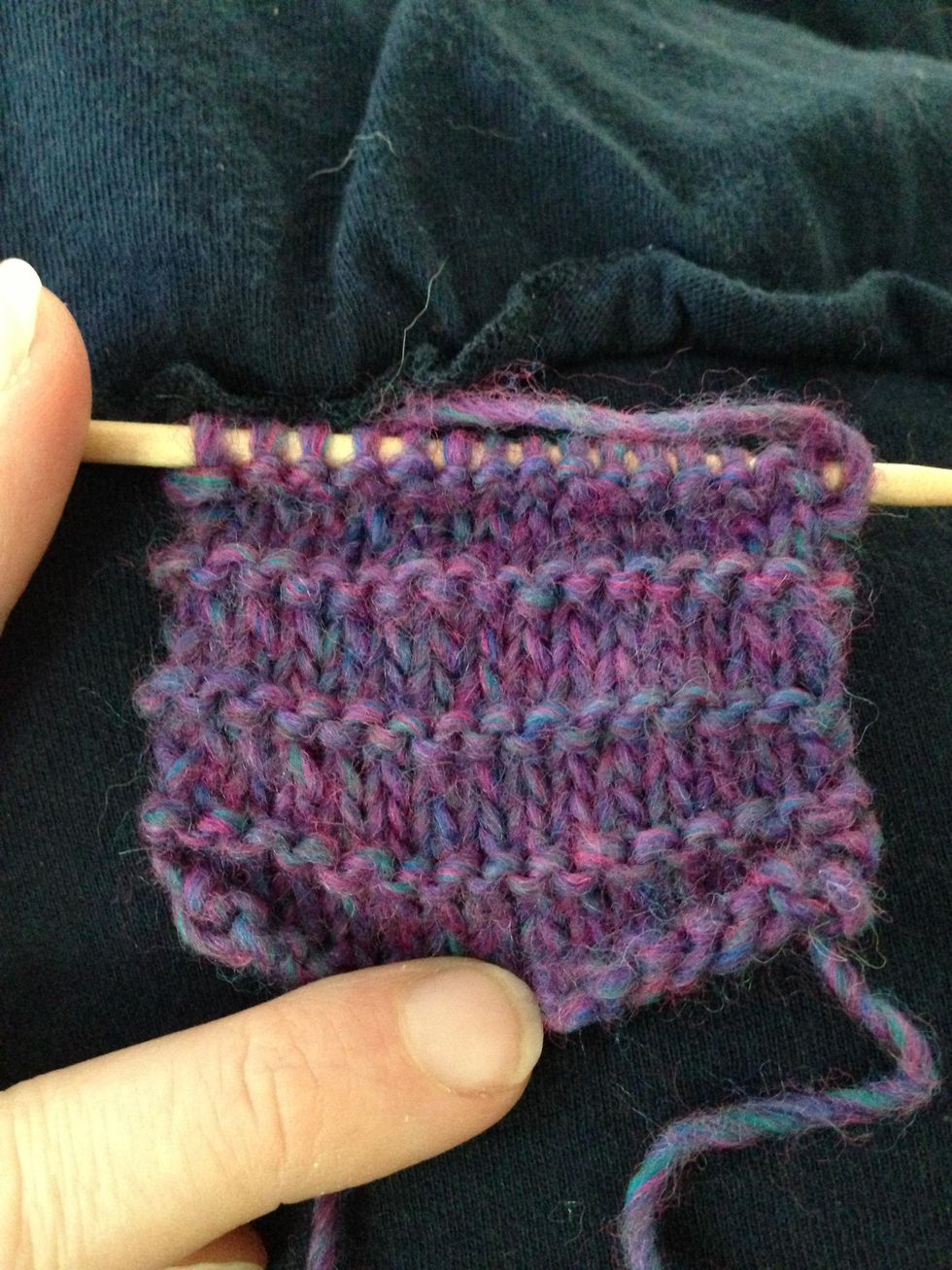 Abbreviations: k: knit, p: purl, co: cast-on, st: stitchco any number of sts. I co 15 sts.Row 1: k all stsRow 2: p all stsRow 3: k all stsRow 4: k all stsRepeat rows 1-4 until desired length is reached. This swatch is made up of 3 repeats.