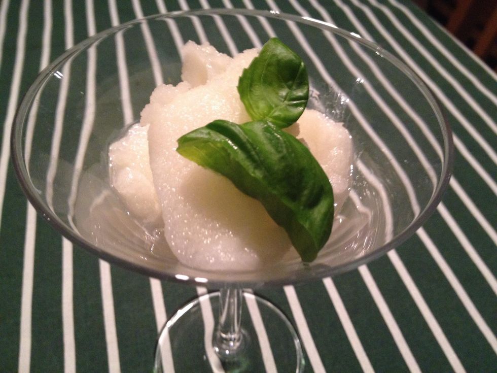 Serve the sorbet in a martini glass or similar, and decorate it with basil leaves.