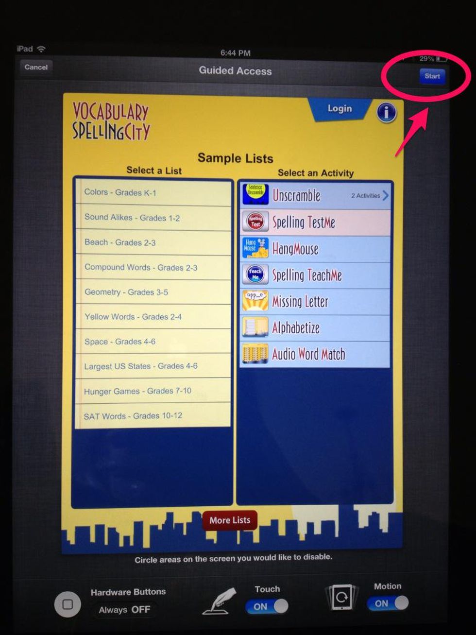 Open the app that you want the kids to work in. I've opened the app, Vocabulary Spelling City. Once your app is open, triple click the Home button.