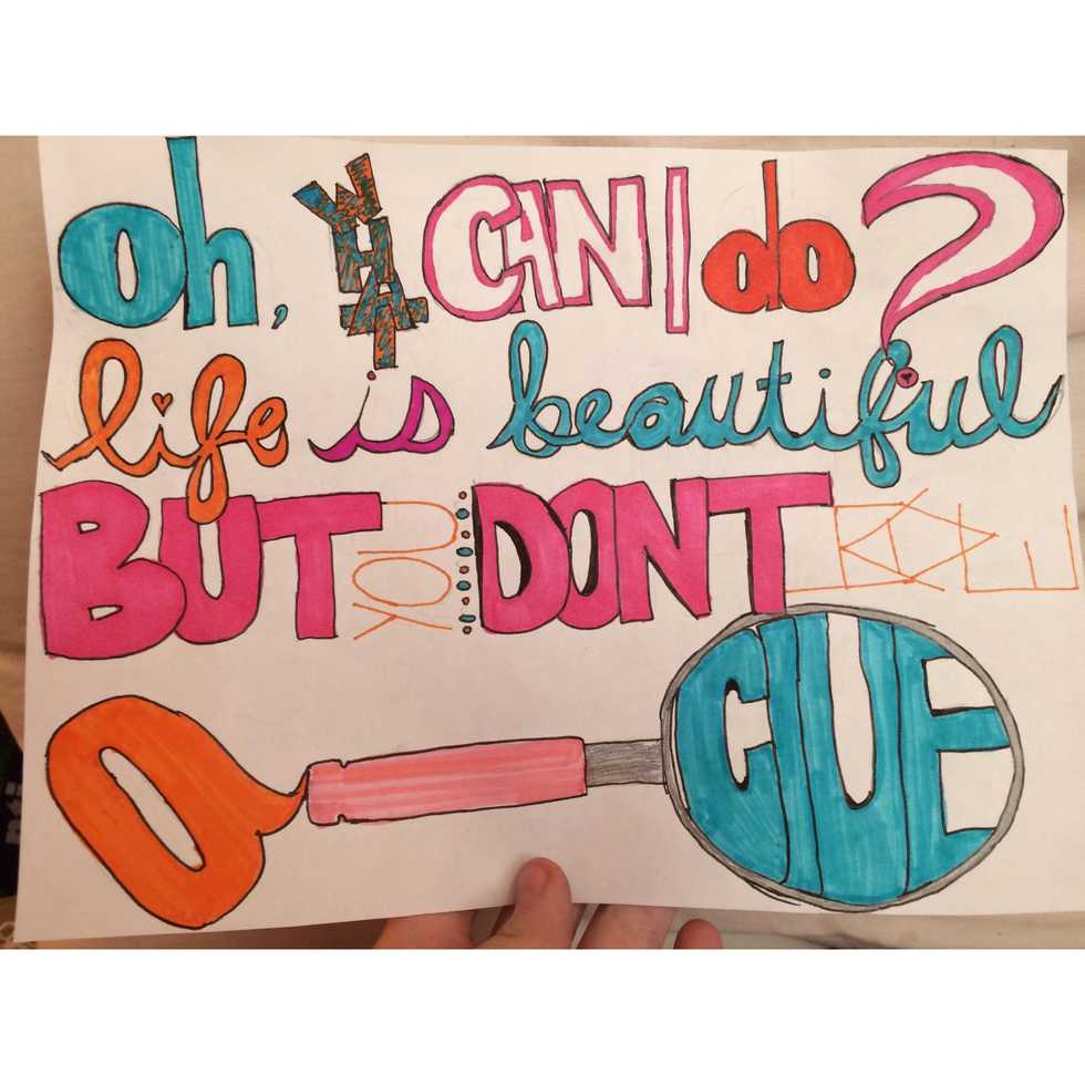Once you've finished your drawing, outline the words with your black pen or felt tip. Take your time, this can be somewhat difficult.