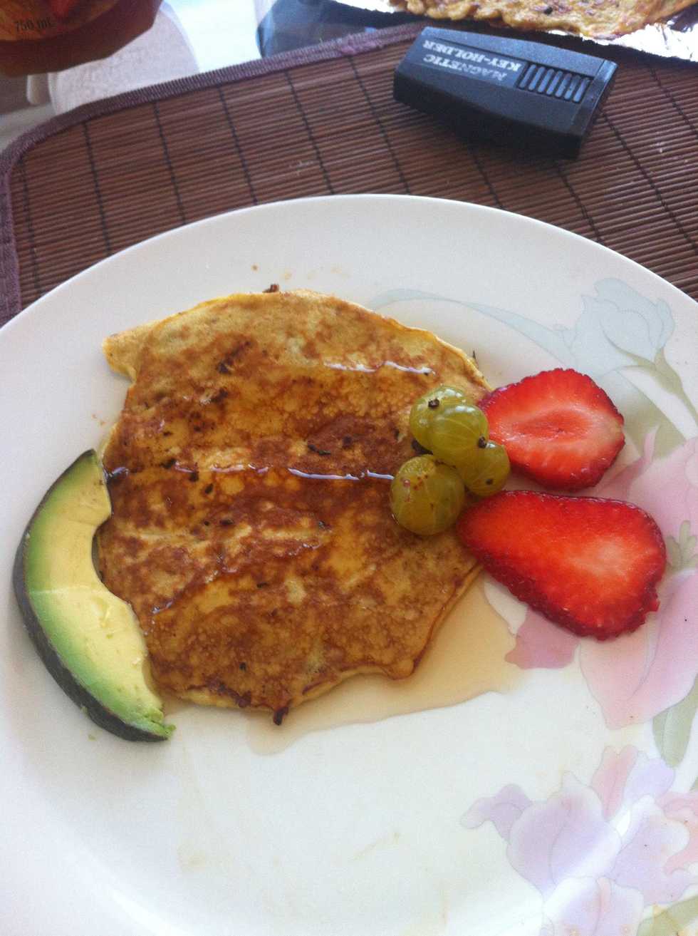 All done! Here is one of the pancakes garnished! I poured a little maple syrup on as well, which is obviously optional! Enjoy :))