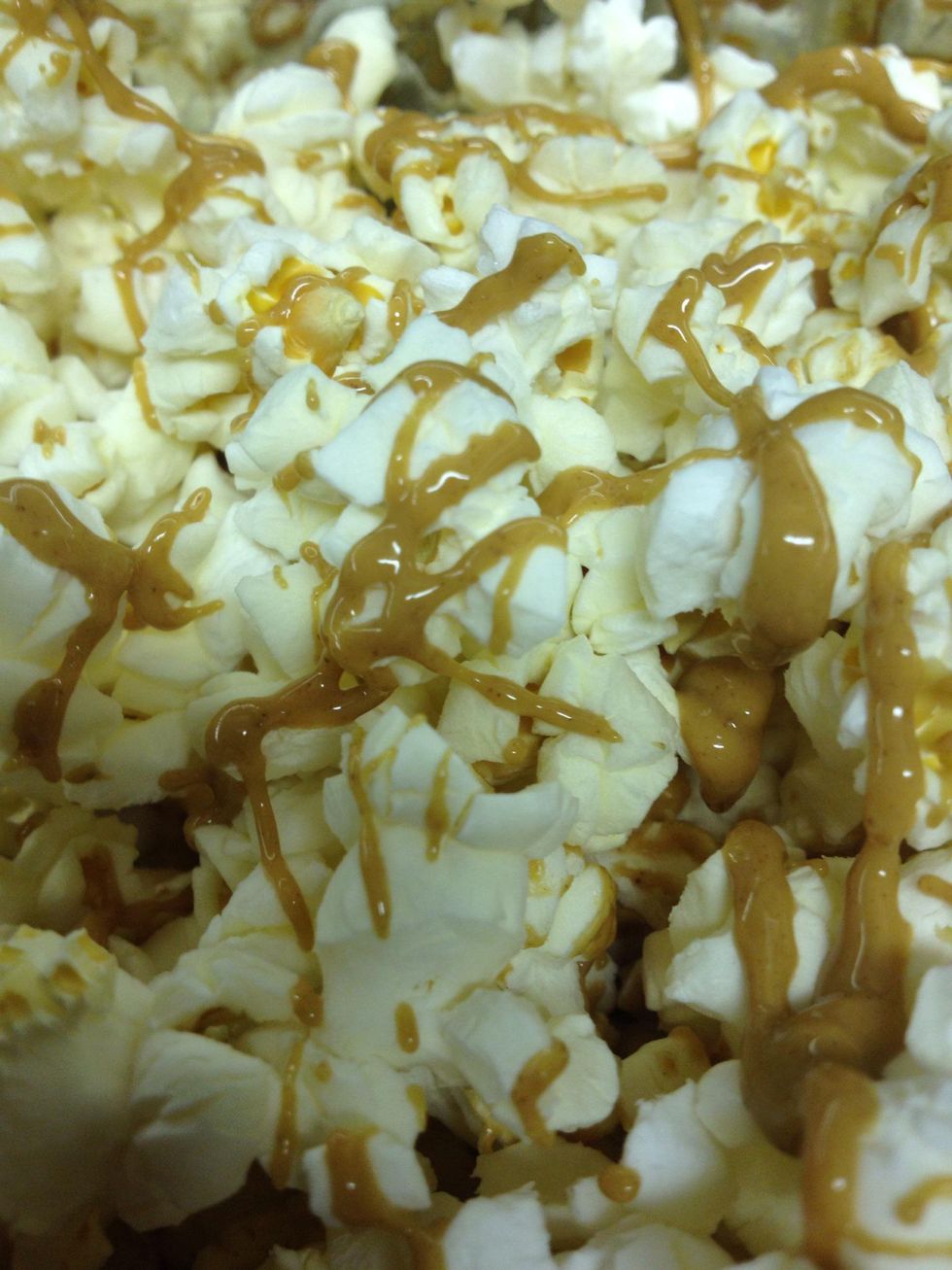 Drizzle the peanut butter on the popcorn with a spoon. Put another layer of popcorn on and drizzle the peanut butter. Repeat until all the popcorn is covered.