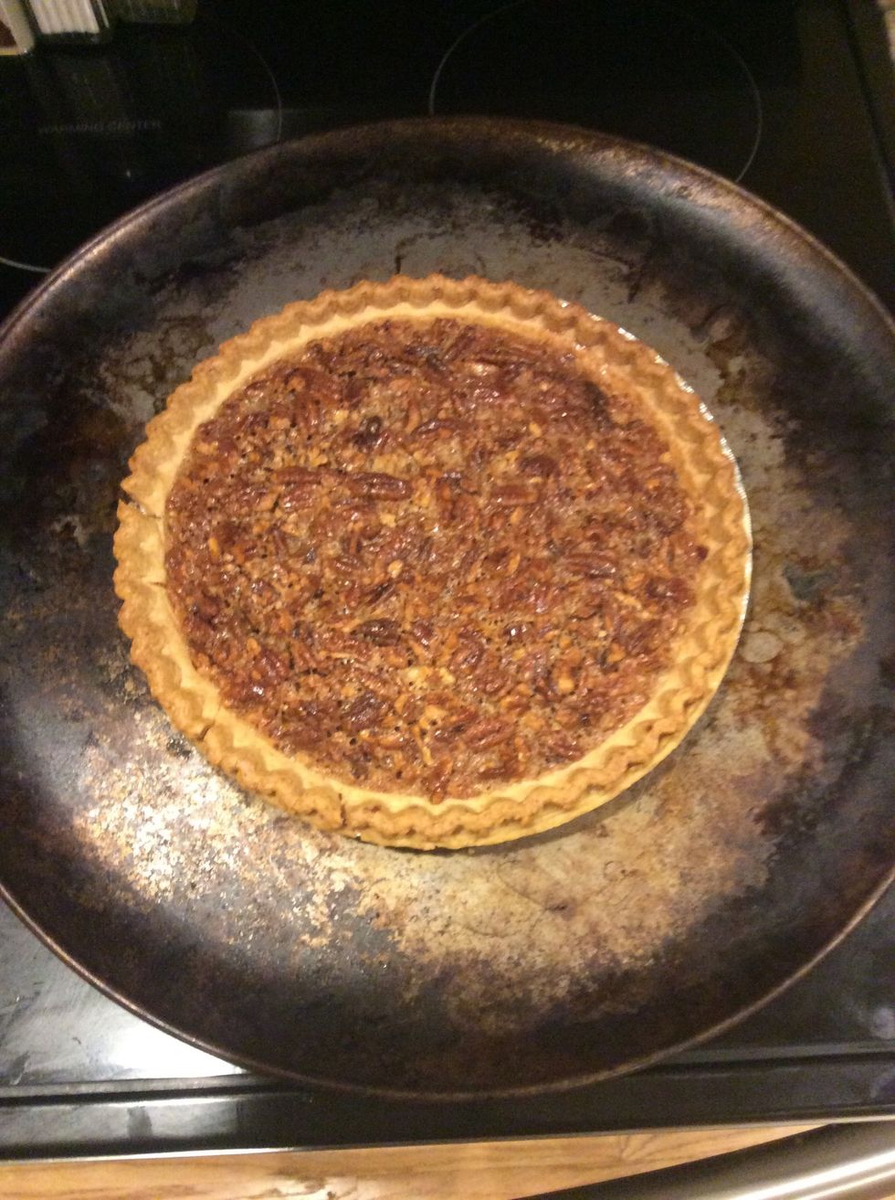 Pour the mixture into the pie crust already layered with pecans on the bottom