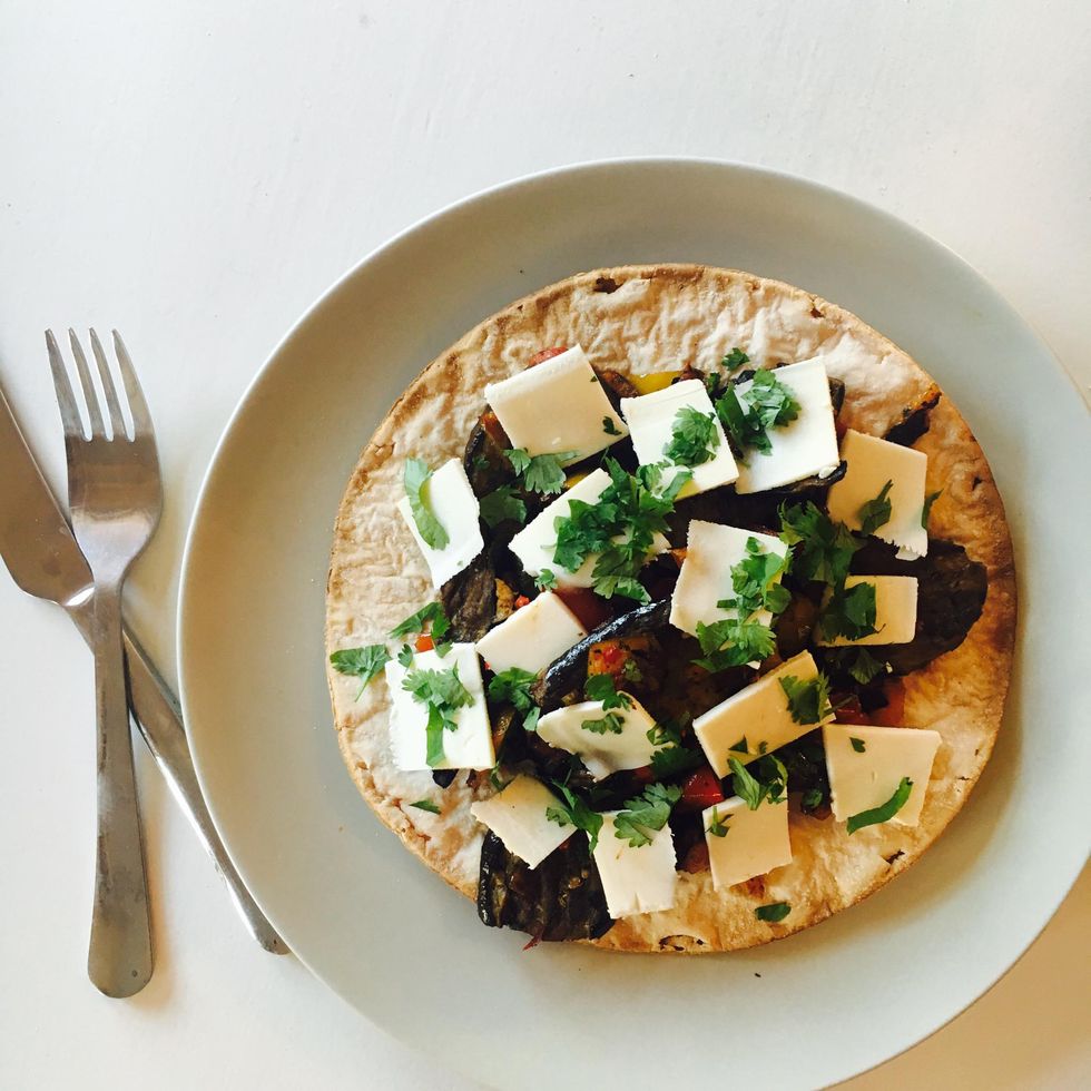 Ingredients. Mixed grilled veg/Mixed veg/stir fry (frozen), red chili, garlic, whole wheat wrap (gf), vegan cheese (mozzarella style)
