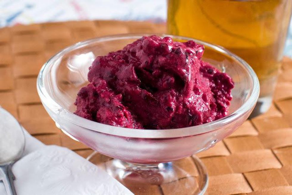 Put the frozen fruit, yogurt, and sugar into a blender or food processor and pulse until it's soft and creamy.