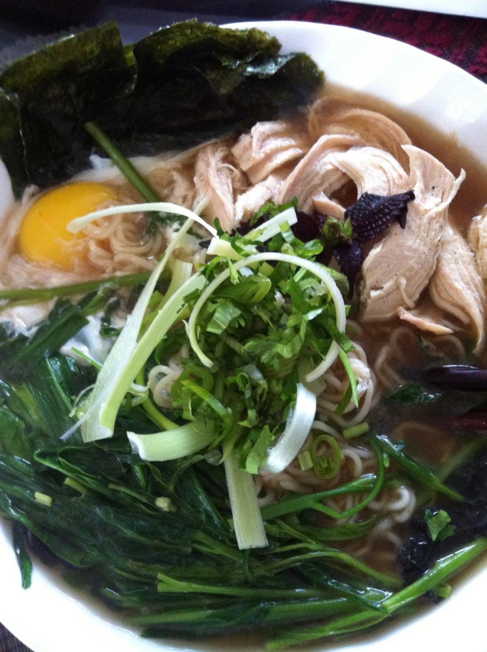 Pour your boiling broth into your bowl - if you have an egg in there, make sure you pour it onto the egg to cook it, unless you like raw egg mixed into the noodles (it's quite delicious)!