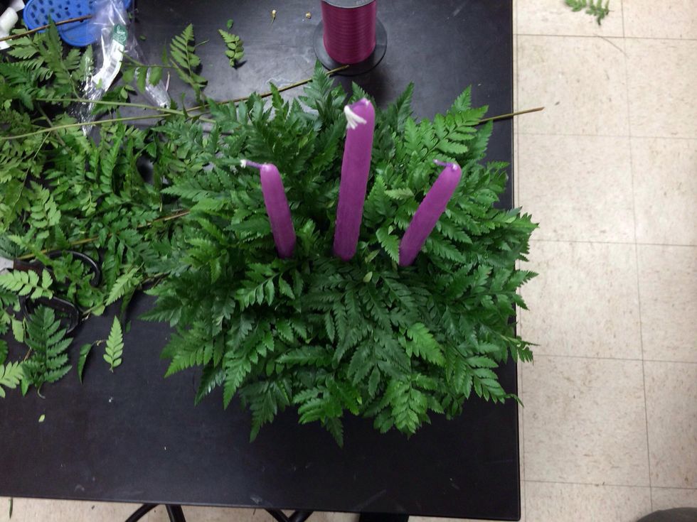 Put shorter greens in and around candles to cover the rest of oasis.