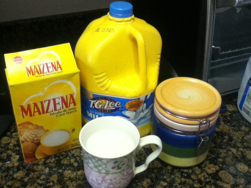 On the left is the cornstarch, then milk, then sugar. I buy this rich cornstarch at Hispanic markets, the name is "Maizena".