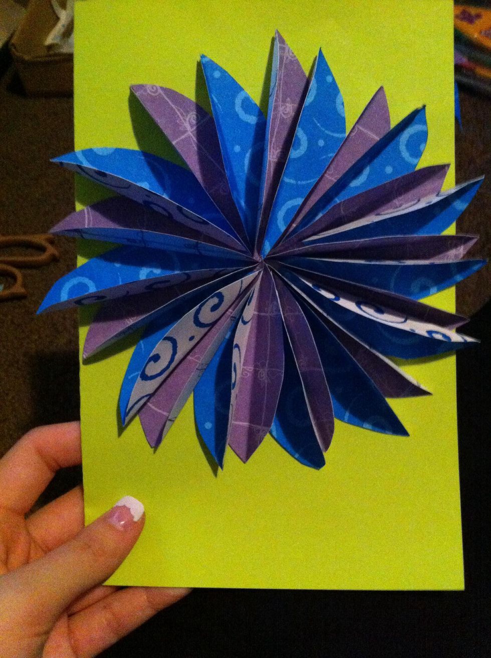Step 11: Next grab your third colored paper and do the same thing you did in step 5. Now you should have 12 more petals. After that glue them in between the other petals.