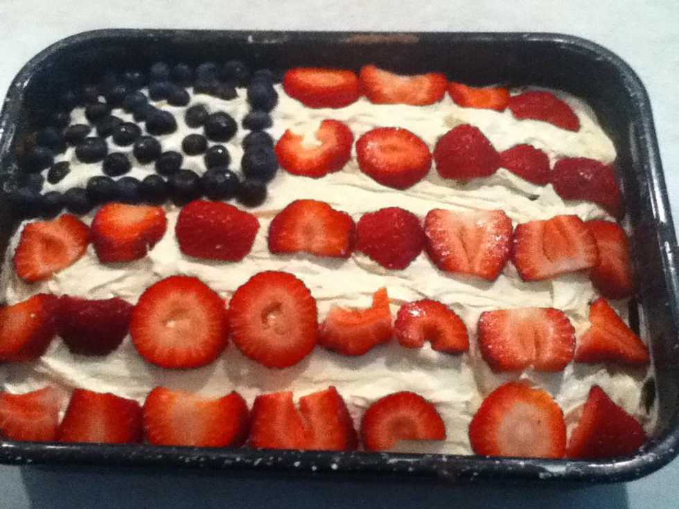 Take the strawberries and make them as the stripes and you're done! :) enjoy your superbly delicious cake! It barely lasted a day. I had like 4 pieces...haha :)