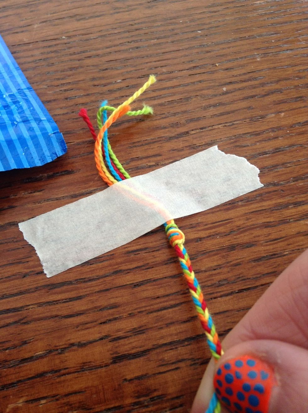 Tape your strings down, and begin the bracelet, by picking up the string farthest to the left.