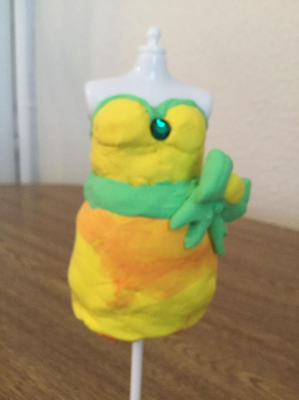 Add the yellow clay to your dress make sure it only goes up to the waist tops. Then add a little bit extra and leave it right under the boobs . Make sure you are doing it the whole way round .