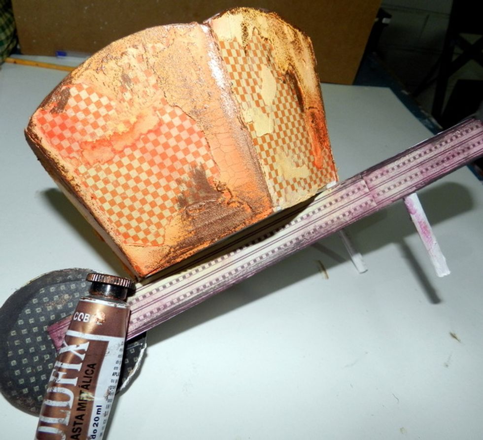 Apply crackle paste on some places of the wooden wheelbarrow and after dried, apply orange glimmer spray.