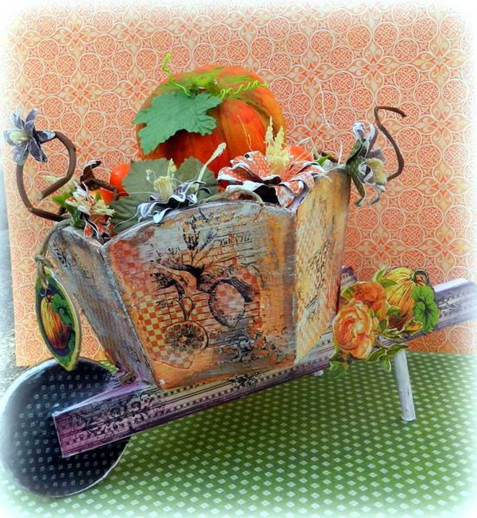 Cover all of the wooden wheelbarrow using G45 An Eerie Tale collection 6x6 papers.