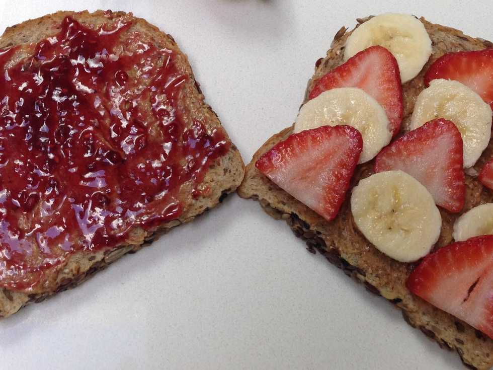 I used Honey Almond Butter, but there are many nut butter choices now. Coat a thin layer on both sides, this creates a barrier so the bread doesn't soak up too much jelly or fresh fruit moisture.