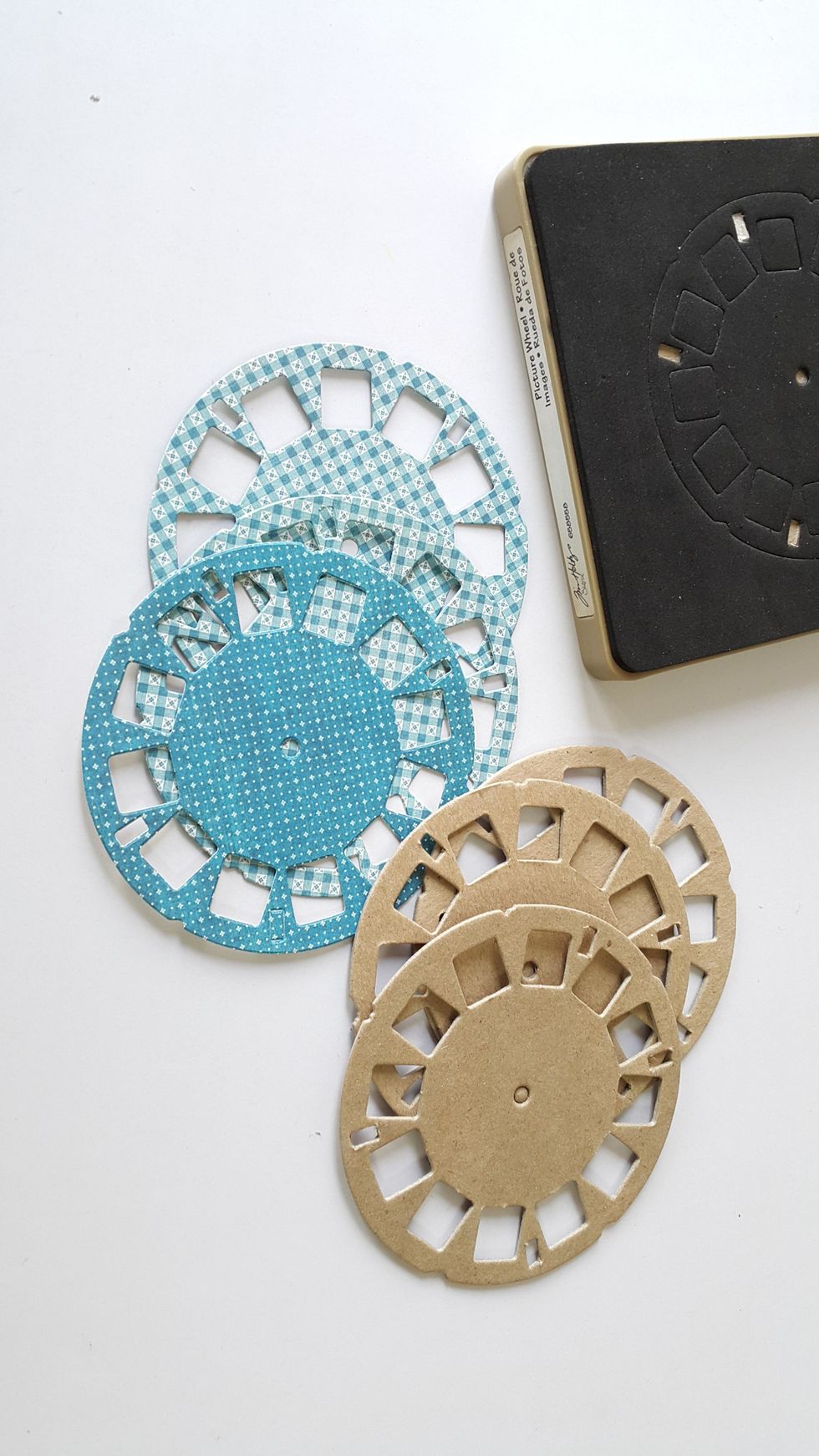Die cut one piece of chipboard and two pieces of papers for the funny fan