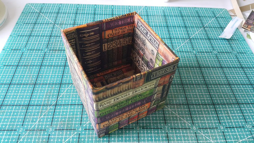 Cover the card top with your favourite Graphic 45 papers and left 1/4" to be adhere on the planner box