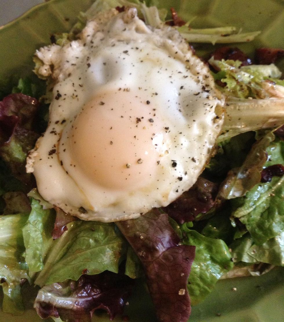 Voila! I know, it might seem strange but trust me, the taste of the warm egg yolk with the lettuce, vinaigrette and bacon is truly amazing! An explosion of flavors and textures in your mouth! Enjoy!