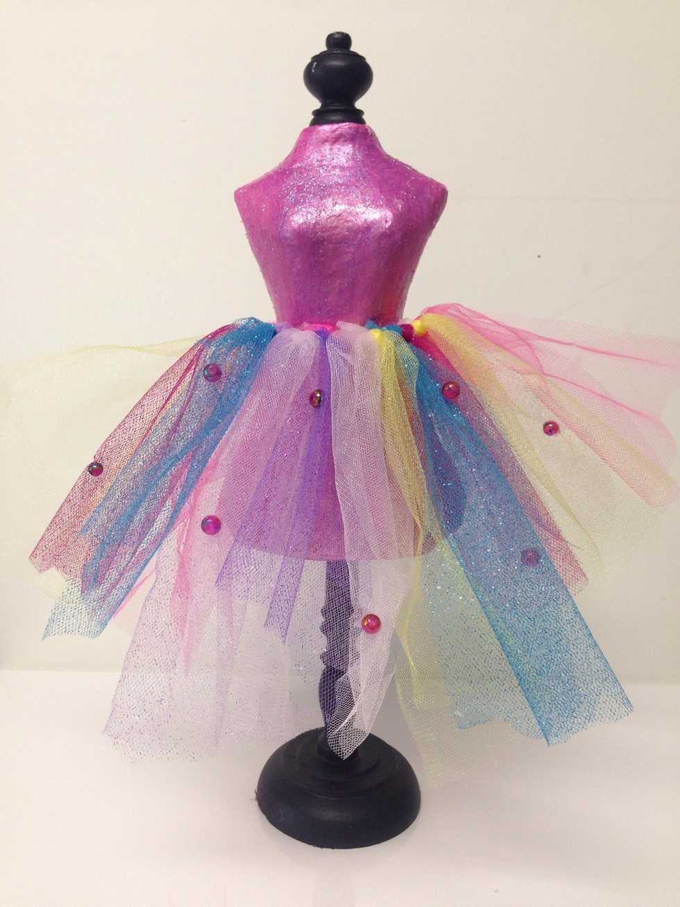 I cut strips of different colored tulle and tied them around a piece of ribbon to make the skirt.