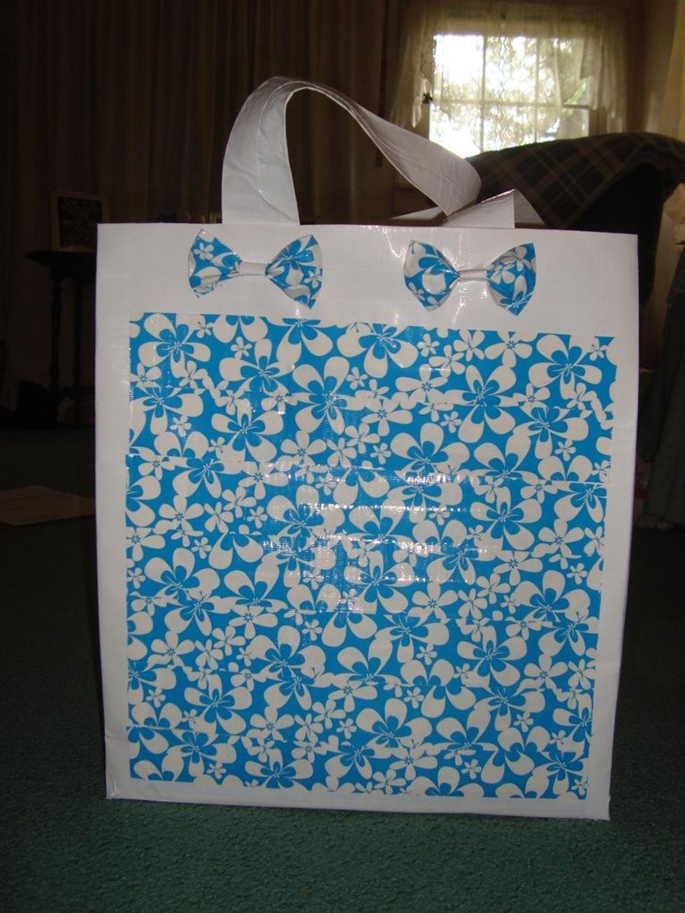 Like this! Make some duct tape bows and tape them to the front and you've got yourself a great beach bag!