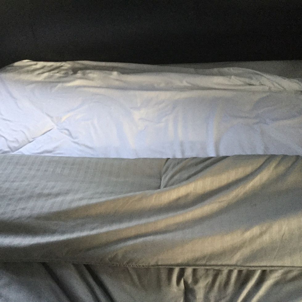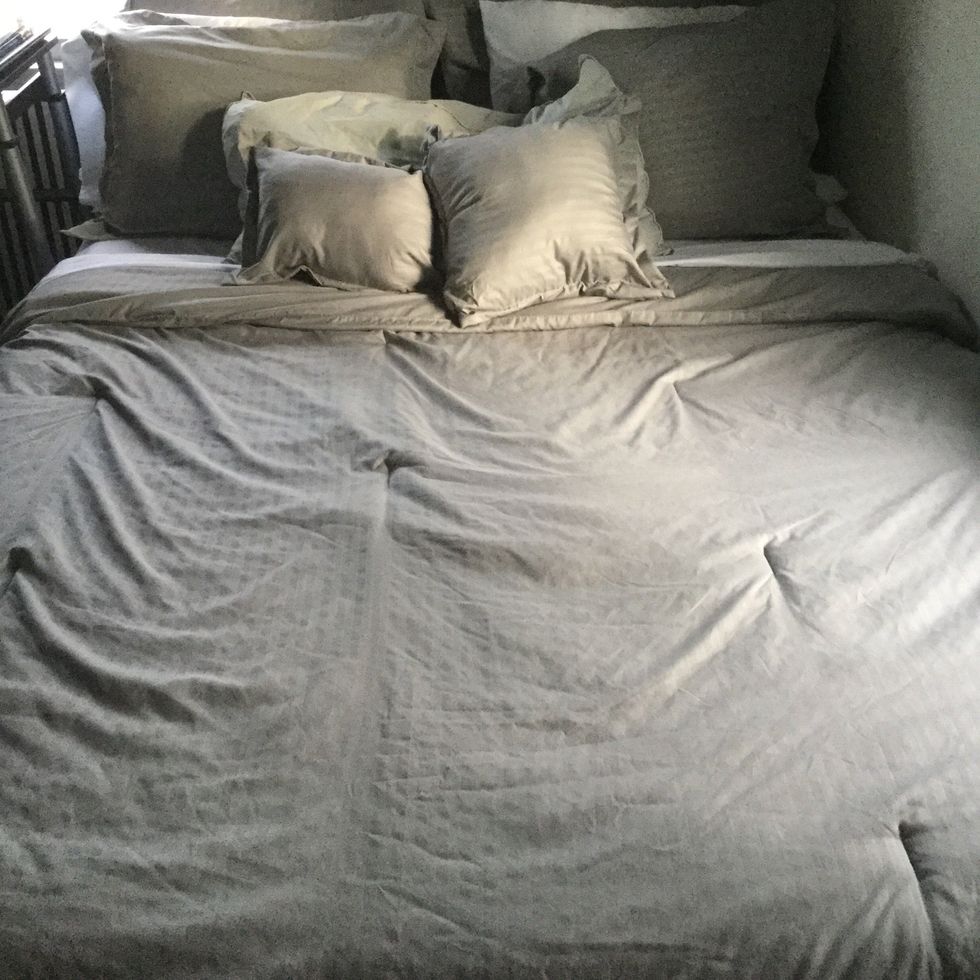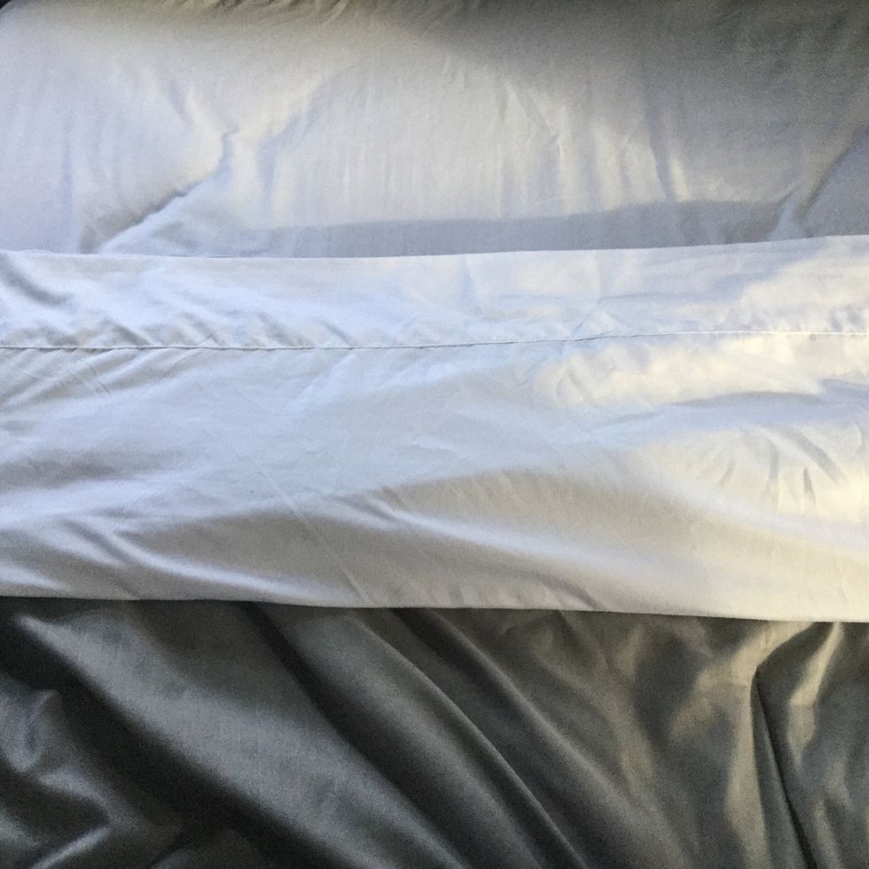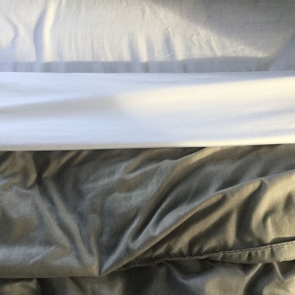 When putting on the comforter, it's best to do this the same way the flat sheet was put on with the fluffing technique. You can tuck the excess under the mattress for an extra tucked-in feel.
