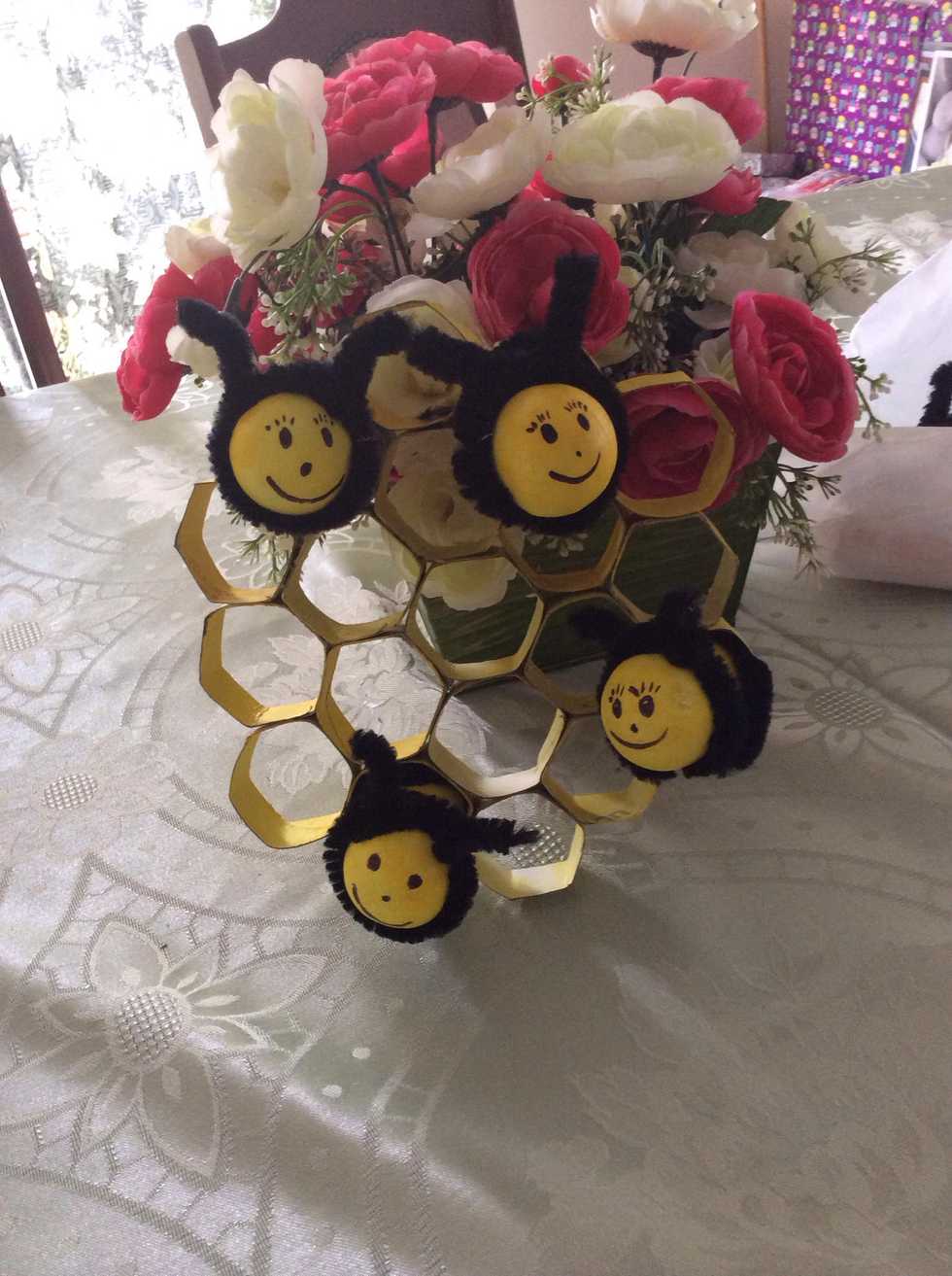 Glue the 5 hexagon piece row to each 4 piece row. Both sides of the 5 hexagon row should have a 4 piece row connected on top and bottom. You know have finished the honeycomb part.