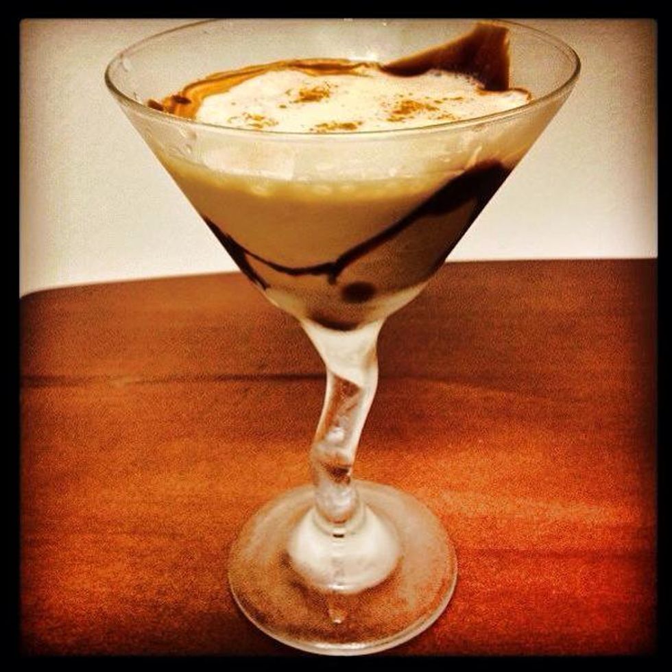 Quickly grab your Martini glass from the freezer and pour in a 1/2 ounce if Chocolate Syrup around the glass. Try to make it swirl. :)