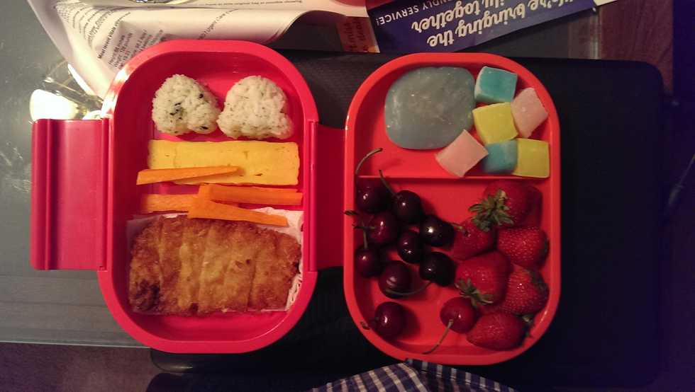 To finish up, slice your tamago into thin strips and slice your carrots into slivers. Carefully lay pork cutlet into bento box. Fill your bento box with your fruit, vegetables, rice balls and mochi.