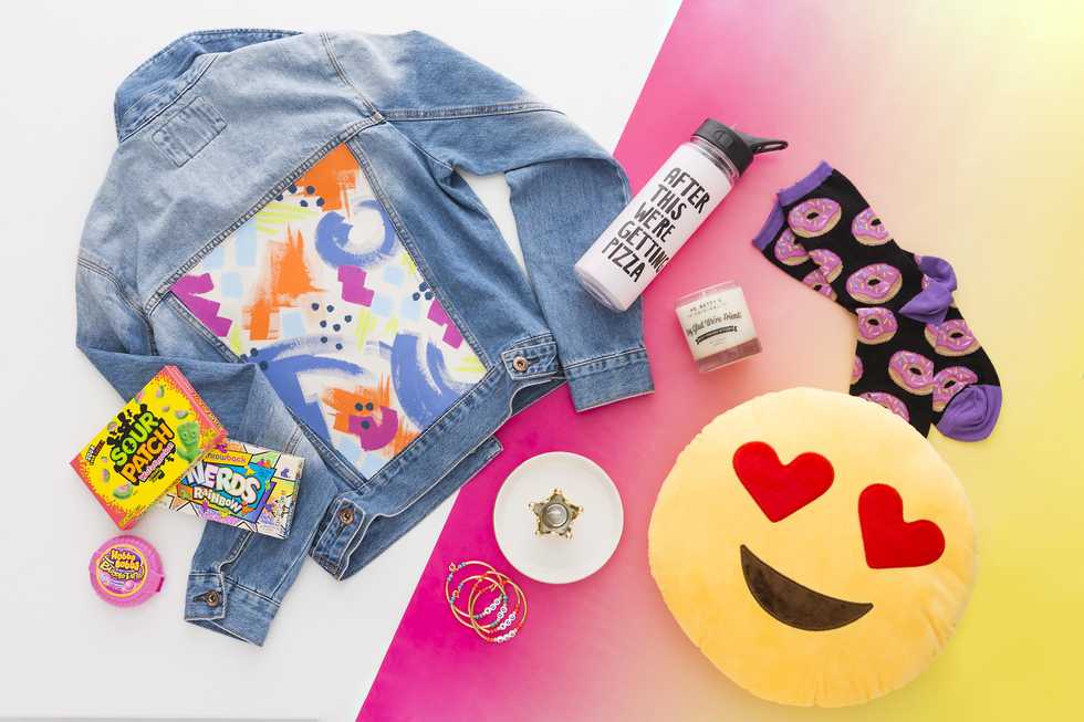 Now it’s time to fill the rest of your care package with fun goodies that your best friend will love, like emoji pillows, fun donut socks, throwback candy and scented candles.