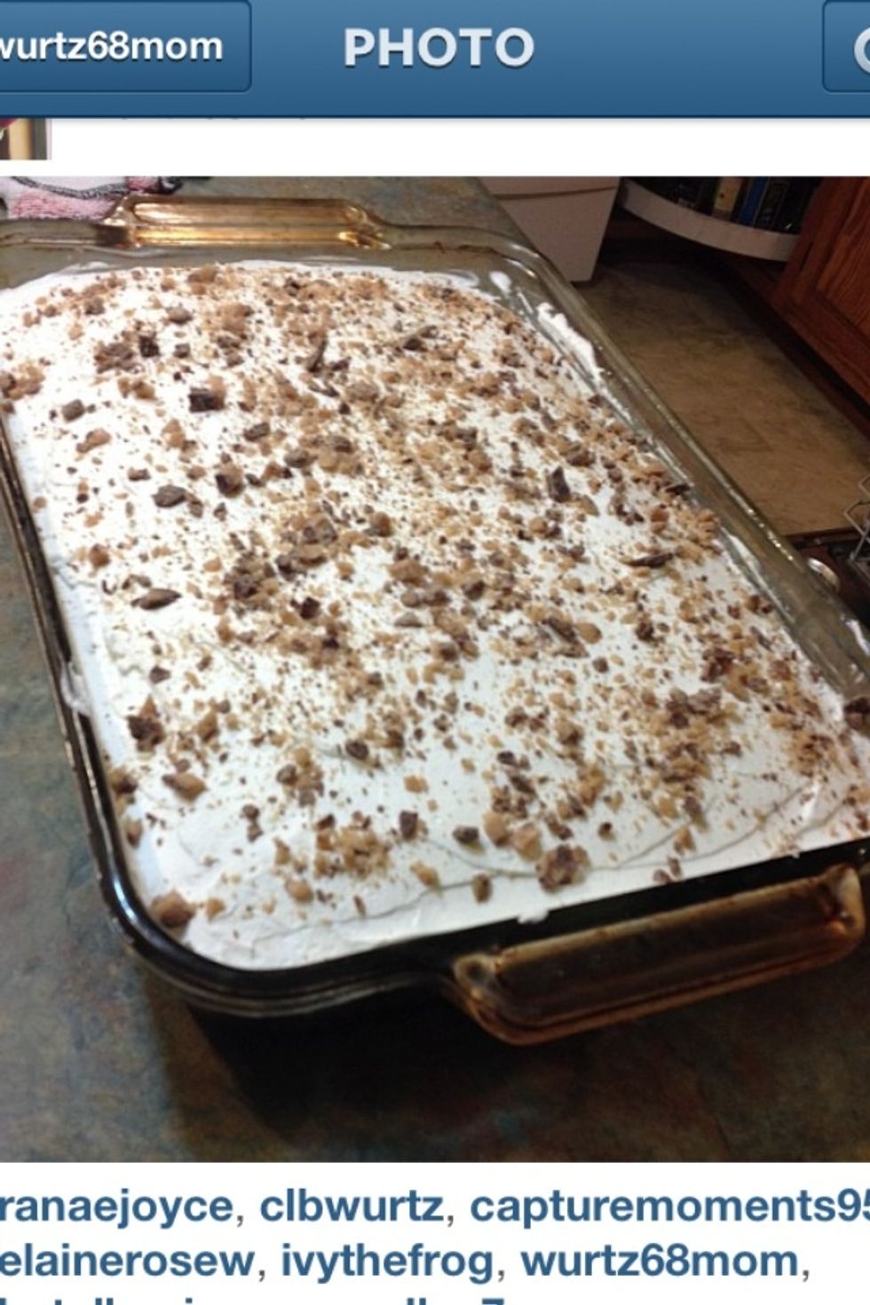 Once the cake is completely cooled off (you can put it in the Refrigerator) spread whipped topping over the cake and then crushed heath bar.