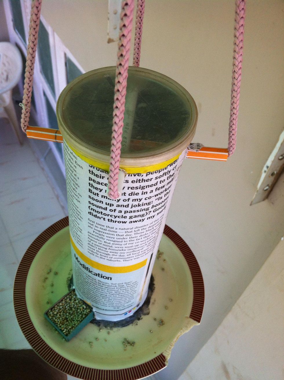 Cut through the bottom of the can and insert the matchbox halfway. Fill the whole can with grain and tie it up in the backyard where there isn't much human activity. Keep away from cat's reach.