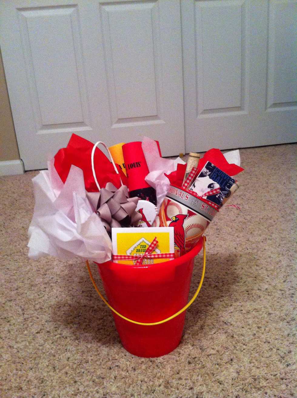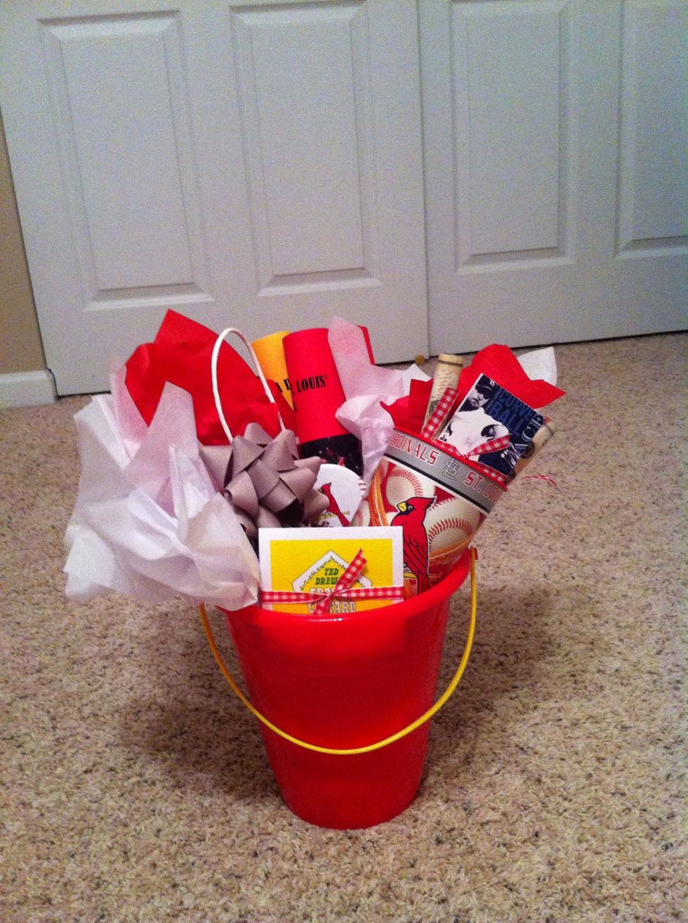 Fill in your bucket however you would like! I went with a St. Louis Theme. 2 Cardinals Tickets, a gift card to a restaurant on The Hill, and a gift card to Ted Drew's.