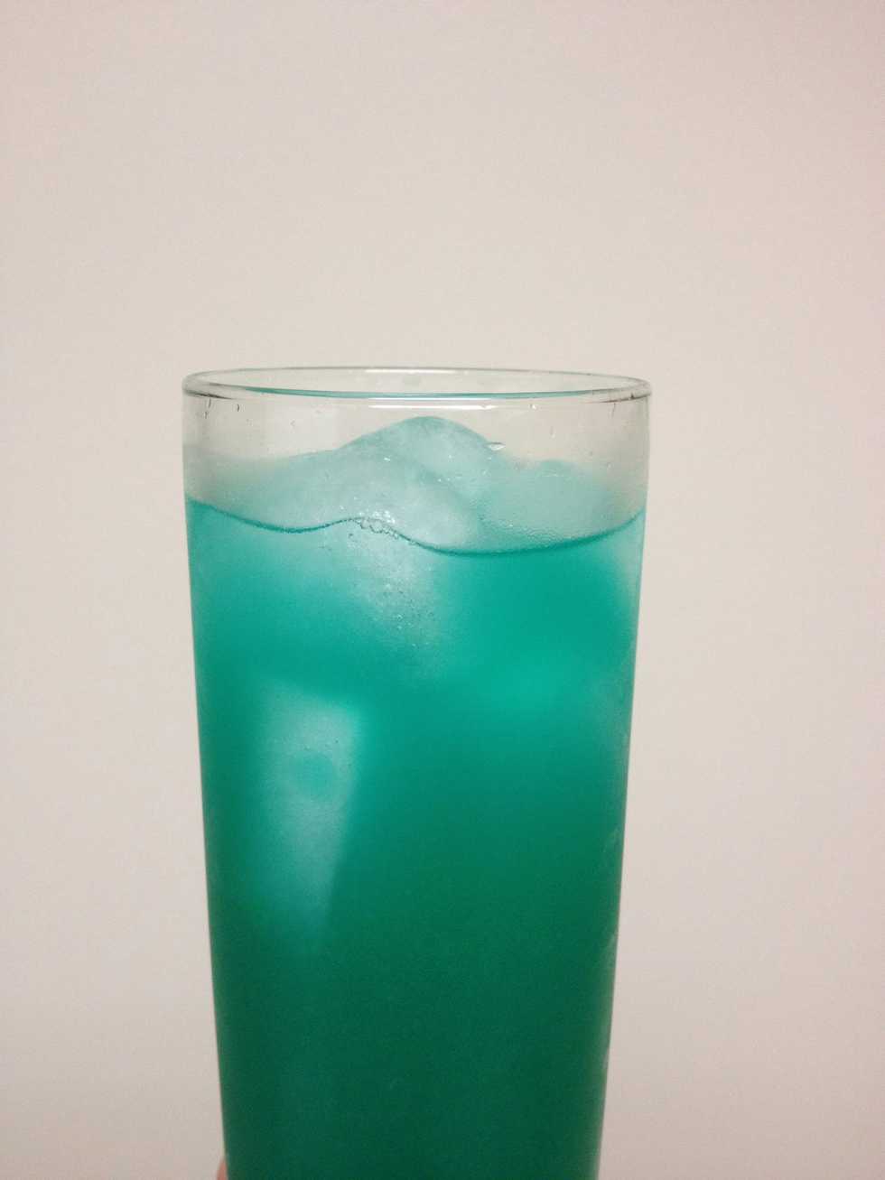 Then, add 1 1/2 ounces of Blue Curaçao into the glass.
