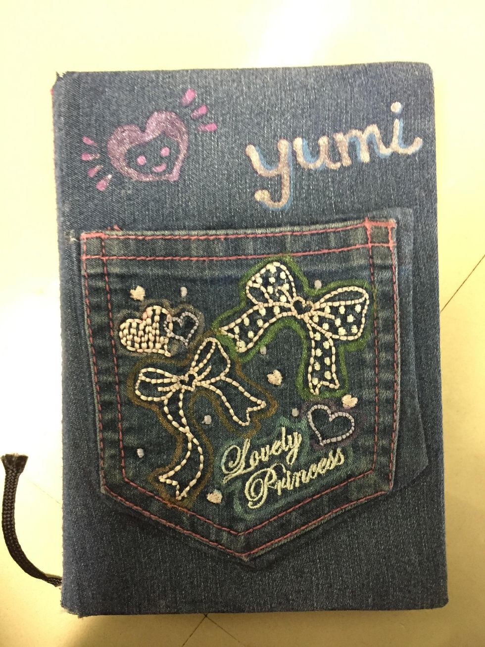 Now glue your left over area of the jeans (red circle) IN to your front cover of your book