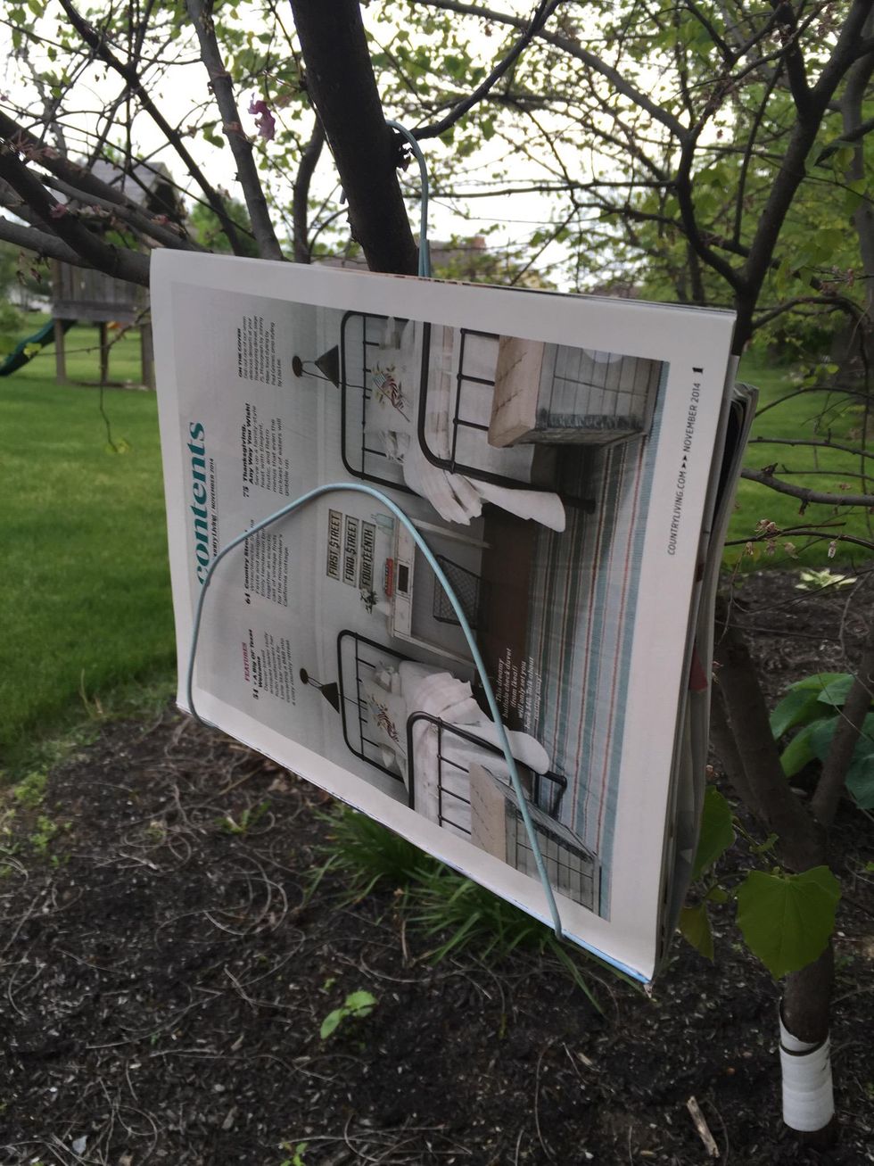 Here is the fun part! Pick a nice color to spray paint it. Make sure you don't do it on a windy day and, do it outside on cardboard. You can also wrap the hanger with string or pretty tape.