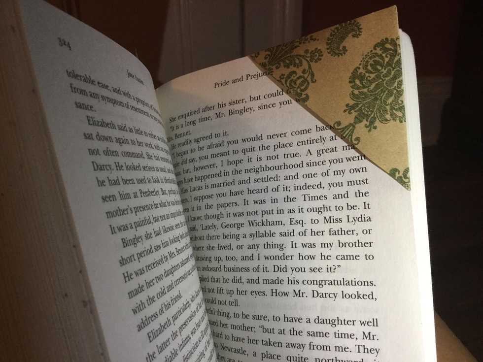 Slide the bookmark into the corner of a page, smaller side facing up.