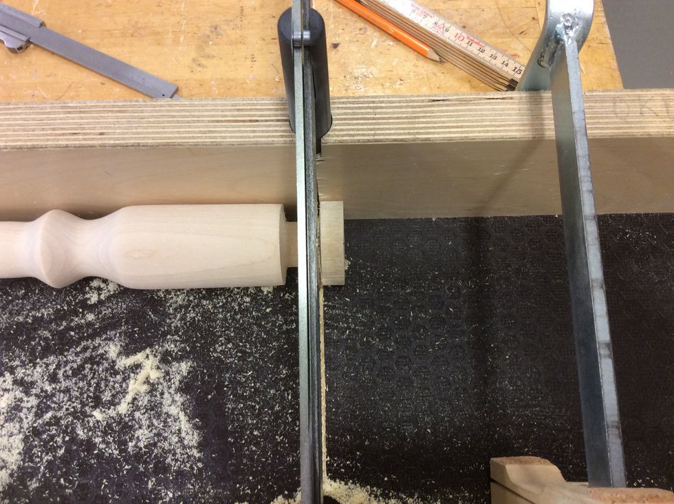 Såga ett exakt lika stort håll på backsidan av bordskivan där den övre delen av svarvbenet måste passa in.