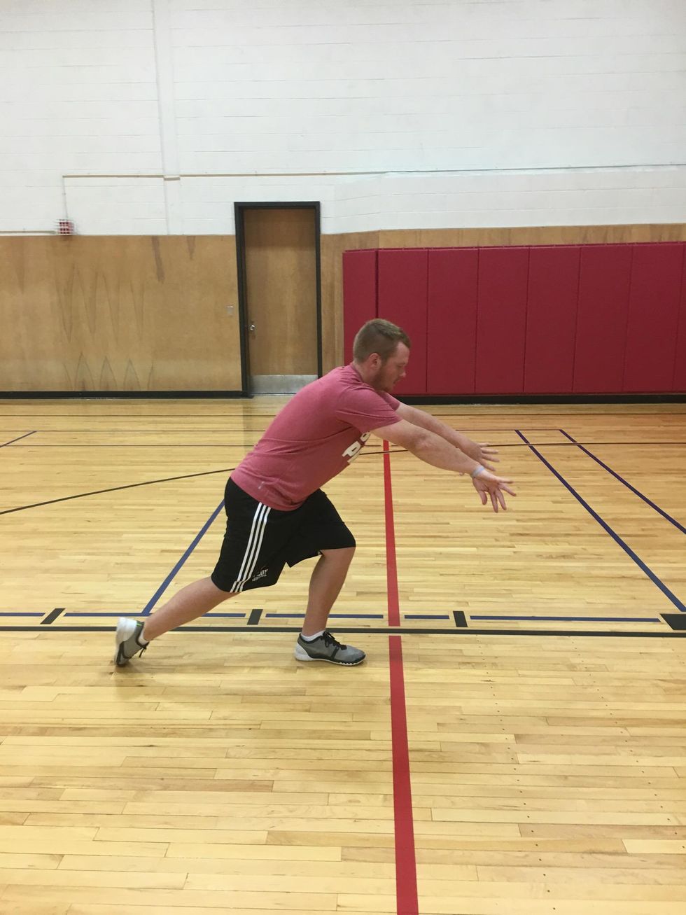 Push the ball down towards the ground with both hands while taking a step. Aiming about 3/4 of the way to the intended target. Thumbs down and palms away.